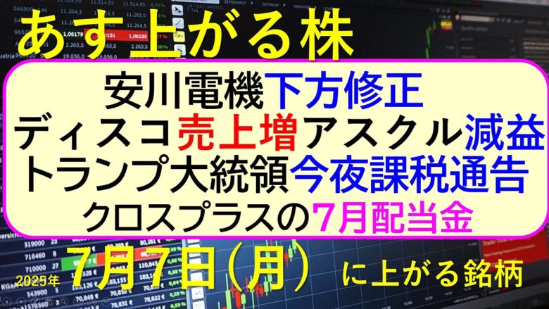 あす上がる株 2025年7月7日(月)に上がる銘柄。安川電機、下方修正。ディスコ売上増。アスクル減益。トランプ大統領、今夜課税通告。クロスプラスの配当~最新の日本株情報。高配当株の株価やデイトレ情報~