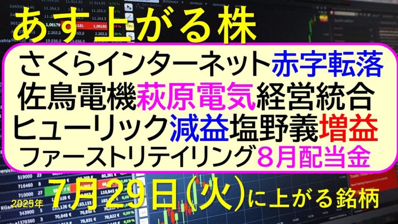 さくらインターネット赤字転落。佐鳥電機と萩原電気が経営統合。ヒューリック減益、塩野義増益。ファーストリテイリングの8月配当金。