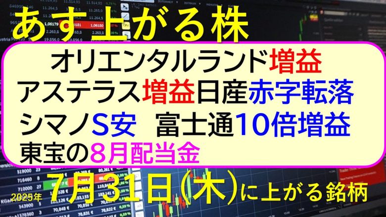 オリエンタルランド増益。アステラス増益。日産赤字転落。シマノS安。富士通10倍増益。東宝の8月配当金。