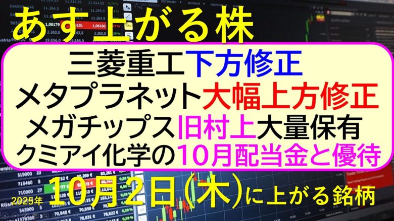 三菱重工下方修正。メタプラネット大幅上方修正。メガチップス旧村上大量保有。クミアイ化学の10月配当金と優待。
