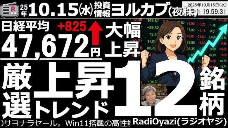 【夜株!(投資情報)】厳選「上昇トレンド12銘柄」を見て行くよ!今日の日経平均は825円高の47,672円だった。先高感の強い相場になっているが、急落には要注意。●今日の注目銘柄:5803フジクラ、他