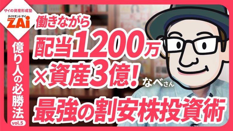 株に投資して30代で1億円を達成し今の資産は3億円以上という40代の会社員・なべさんをインタビュー。狙うのは「PER5~6倍」の超割安株ですが、そのほかの徹底している条件についても解説。年間配当収入は1200万円。最初に立てた資産増加ペースの目標にも資産を着実に築くヒントが! 会社員が真似しやすい、じっくり利益を増やしていく投資ワザを語ってくれました。