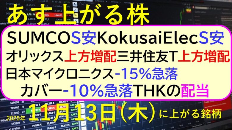 SUMCOストップ安。KokusaiElectricストップ安。オリックス上方増配。三井住友T上方増配。日本マイクロニクス15%急落。カバー10%急落