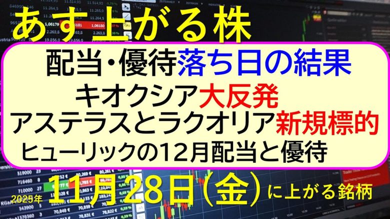 配当・優待落ち日の結果。キオクシア大反発。アステラスとラクオリア新規標的。ヒューリックの12月配当と優待