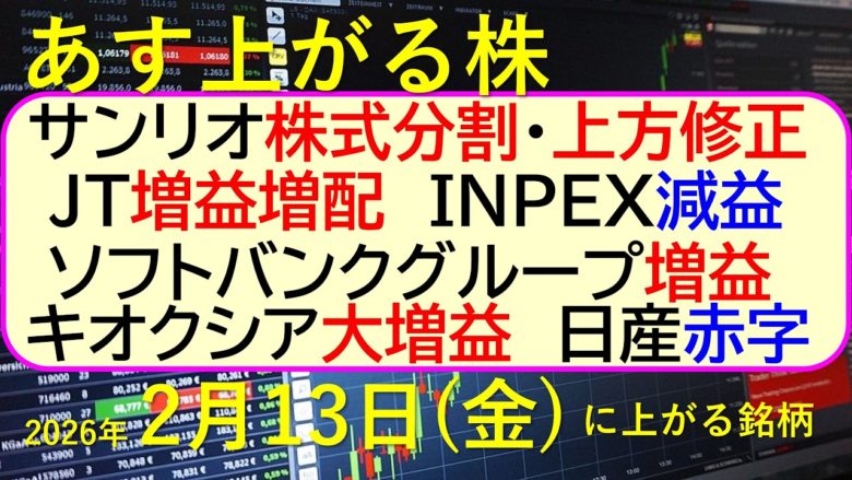~あす上がる株 2026年2月13日(金)に上がる銘柄~あす上がる株。最新の日本株情報。高配当株の株価やデイトレ情報~