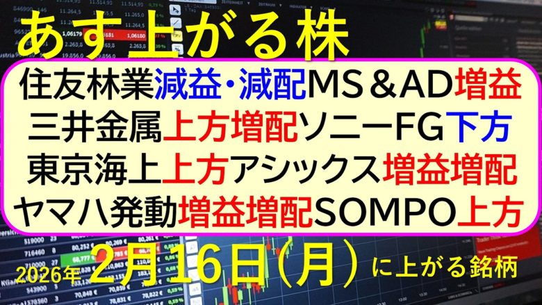 住友林業減益・減配。MS&AD増益。三井金属上方増配。ソニーFG下方。東京海上上方。アシックス増益増配。SOMPO上方。。~あす上がる株 2026年2月16日(月)に上がる銘柄。~最新の日本株情報。高配当株の株価やデイトレ情報~
