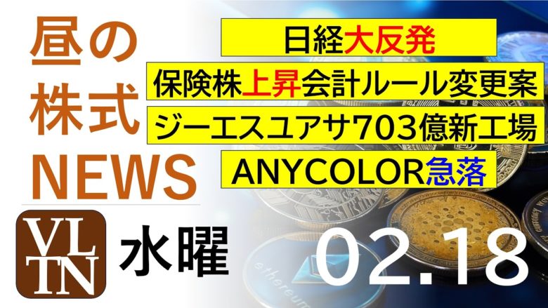 日経が大反発。保険株上昇、会計ルール変更案。ジーエスユアサが703億新工場。ANYCOLOR急落。。2026年2月18日(水)~明日上がる株最新の日本株情報。高配当株の株価やデイトレ情報~