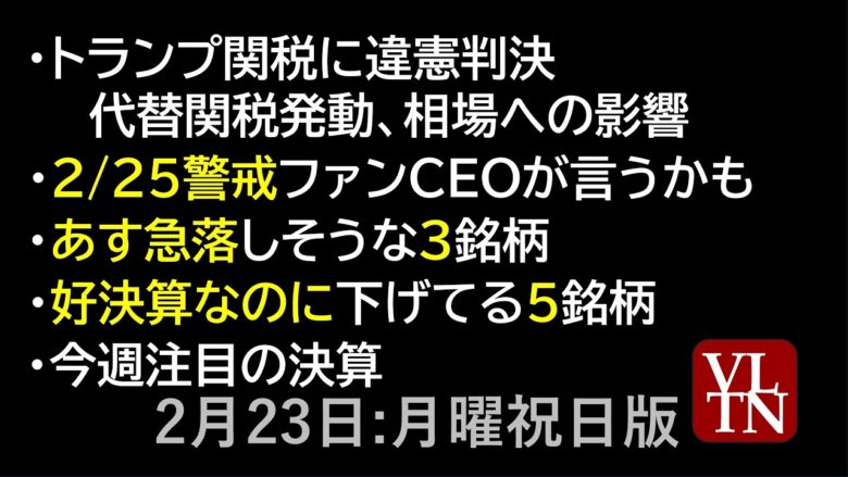 トランプ関税に違憲判決、代替関税発動、相場への影響。2/25警戒ファンCEO会見。あす急落しそうな3銘柄。好決算なのに下げてる5銘柄。今週注目の決算。2月23日:月曜祝日版。~あす上がる株。最新の日本株情報~