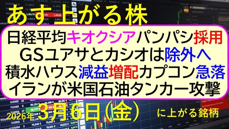 日経平均、キオクシアとパンパシ採用、GSユアサとカシオは除外。積水ハウス減益増配。カプコン急落。イランが米国石油タンカー攻撃。