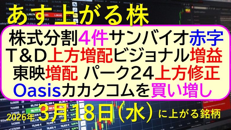 T&D上方増配。ビジョナル増益。東映増配。パーク24上方修正。株式分割が4件。サンバイオ赤字。~あす上がる株 2026年3月18日(水)に上がる銘柄。最新の日本株情報。高配当株の株価やデイトレ情報