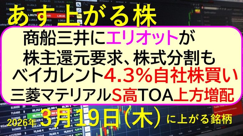商船三井にエリオットが株主還元要求、株式分割も。ベイカレント4.3%自社株買い。三菱マテリアルS高TOA上方増配。