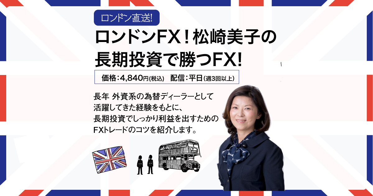 松崎美子の「長期投資で勝つFX!」メルマガを2025年10月21日からダイヤモンド社から始めることになりました。 欧州とイギリス、アメリカからの情報はもちろん、自分のポジションを公開します。 是非よろしくお願い致します。