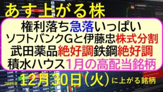 未分類 あす上がる株 2025年12月30日(火)に上がる銘柄。権利落ちの急落がいっぱい。ソフトバンクGと伊藤忠、株式分割。武田薬品、絶好調。鉄鋼、絶好調。~最新の日本株情報。高配当株の株価やデイトレ情報~